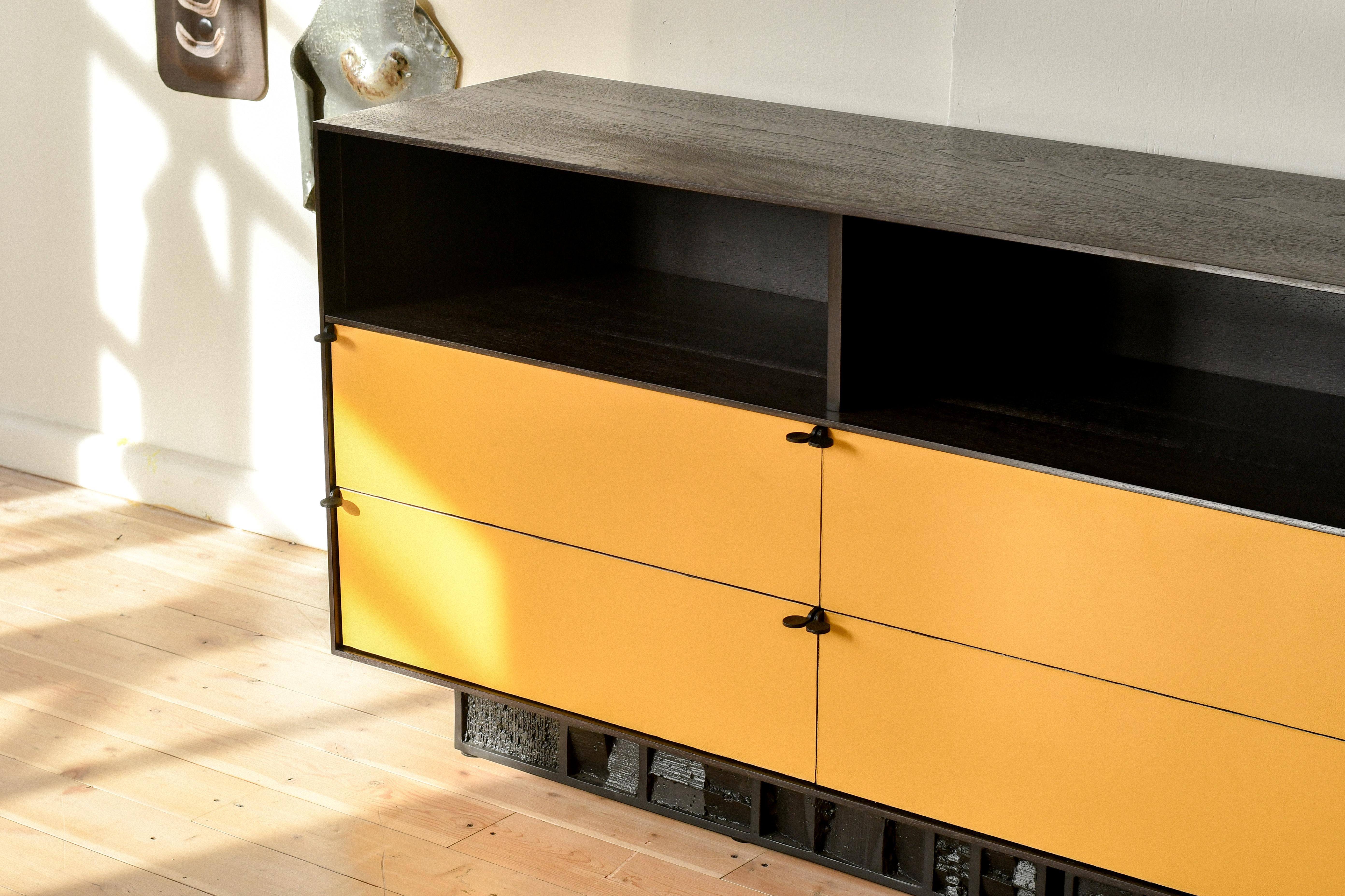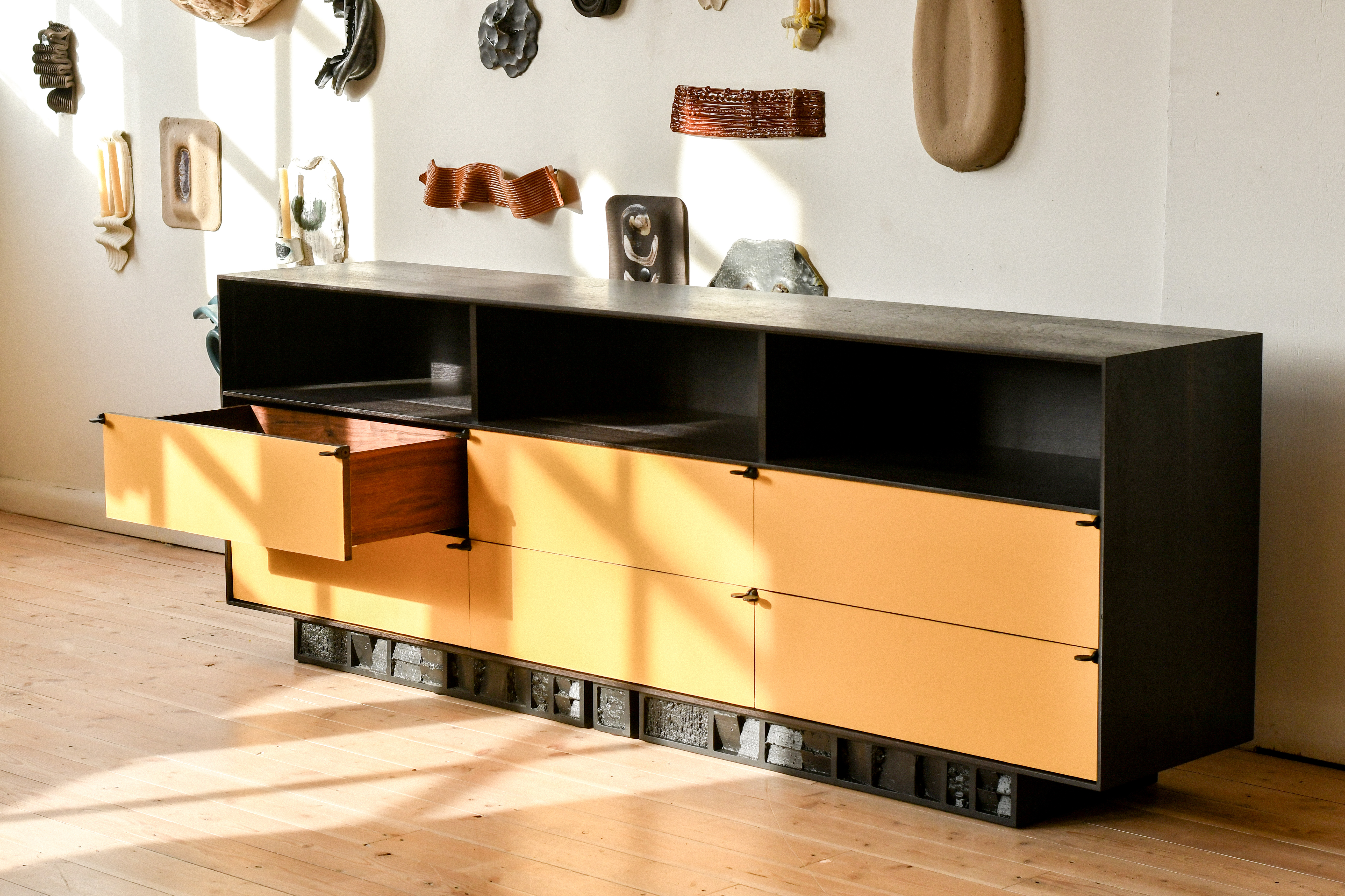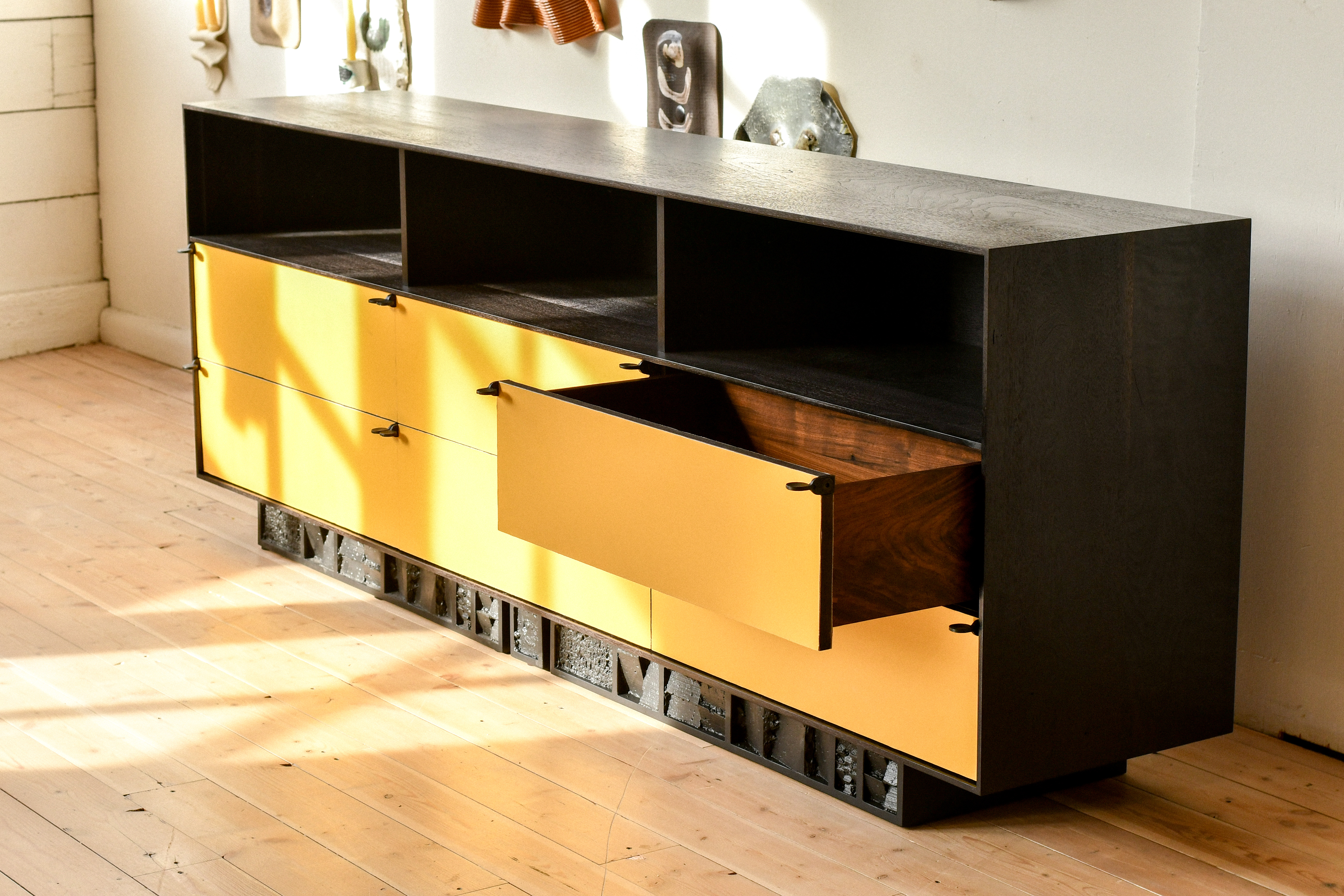 Excavated Furniture is constructed using studio specific casting methods of aluminum and pewter poured into caverns of trenched and hand carved agglomerated cork blanks makes each surface technically unique in its own right, but, like coral growths, operating in a well defined ecological environment. Customizable cabinet bases and pulls which are modular in design spirit.